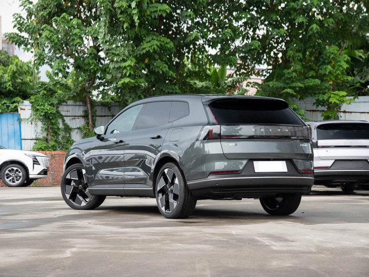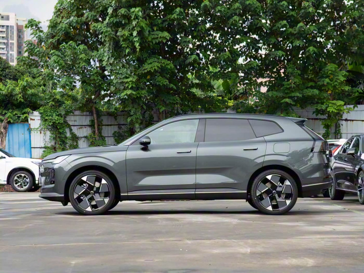 再来看车身侧面部分,4800×1900×1650mm的车身尺寸与2850mm轴距,营造出修长而稳健的轮廓。车身侧面以简约流畅的线条为主基调,完美诠释 “探索与优雅” 的设计理念。虽然具体尺寸尚未公布,但从 “填补 XC60 与 XC90 空白” 的定位可推测,其轴距与车身长度将优于 XC60,为车内空间奠定基础。SUV 级别的离地间隙是核心亮点之一,配合短前后悬的设计,既保证了城市道路的通过性,又为户外探索提供底气,真正实现 “城市通勤 + 野外撒欢” 的双重适配。低风阻轮毂采用多辐式设计,线条纤细精致,有效降低风阻的同时提升了视觉轻盈感。车身侧面没有多余装饰,仅以一条贯穿前后的腰线勾勒轮廓,从翼子板延伸至尾灯,配合微微上扬的窗线,让整车既显修长又不失灵动。